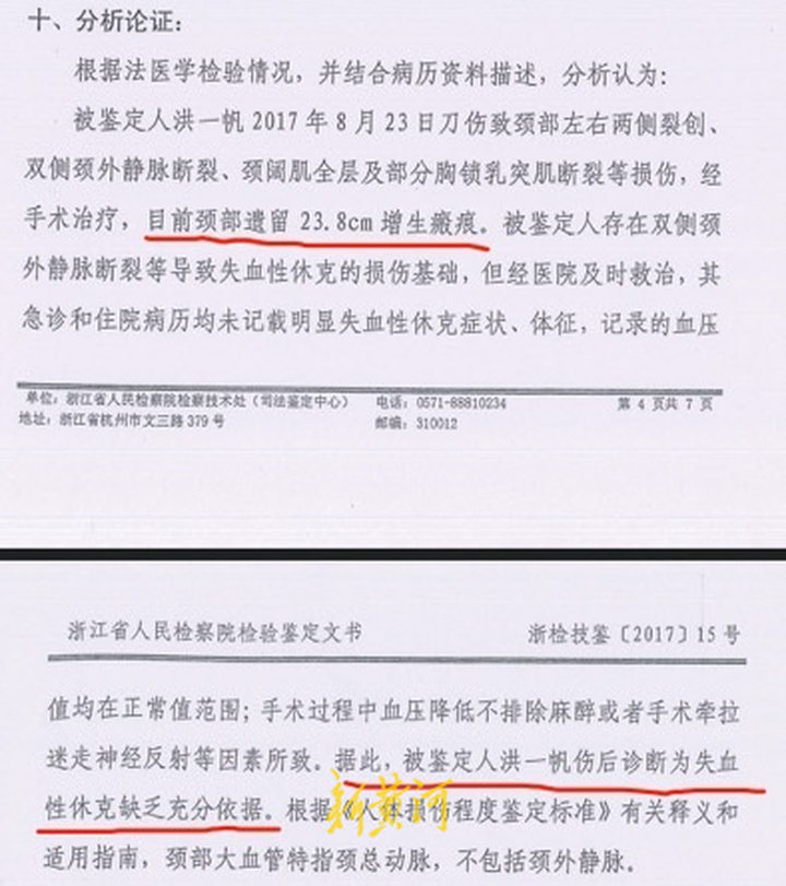 4个月后,浙江省人民检察院检验鉴定书显示,洪某某颈部遗留23.8cm增生瘢痕,其中颈前三角区增生瘢痕面积小于20cm²。洪芳珍不解,“从案发到检察院进行鉴定,时隔4个多月,颈部伤口长度为什么会变长?”
