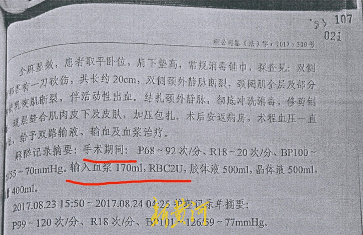 桐乡市公安司法鉴定中心出具的鉴定书显示,手术过程输血浆170ml,红细胞2U。浙江省人民检察院检验鉴定文书中,也认定了同样的输血量。洪芳珍感到疑惑,“鉴定结果中,术后剩余血浆量变成总输血量,少了近一半。”