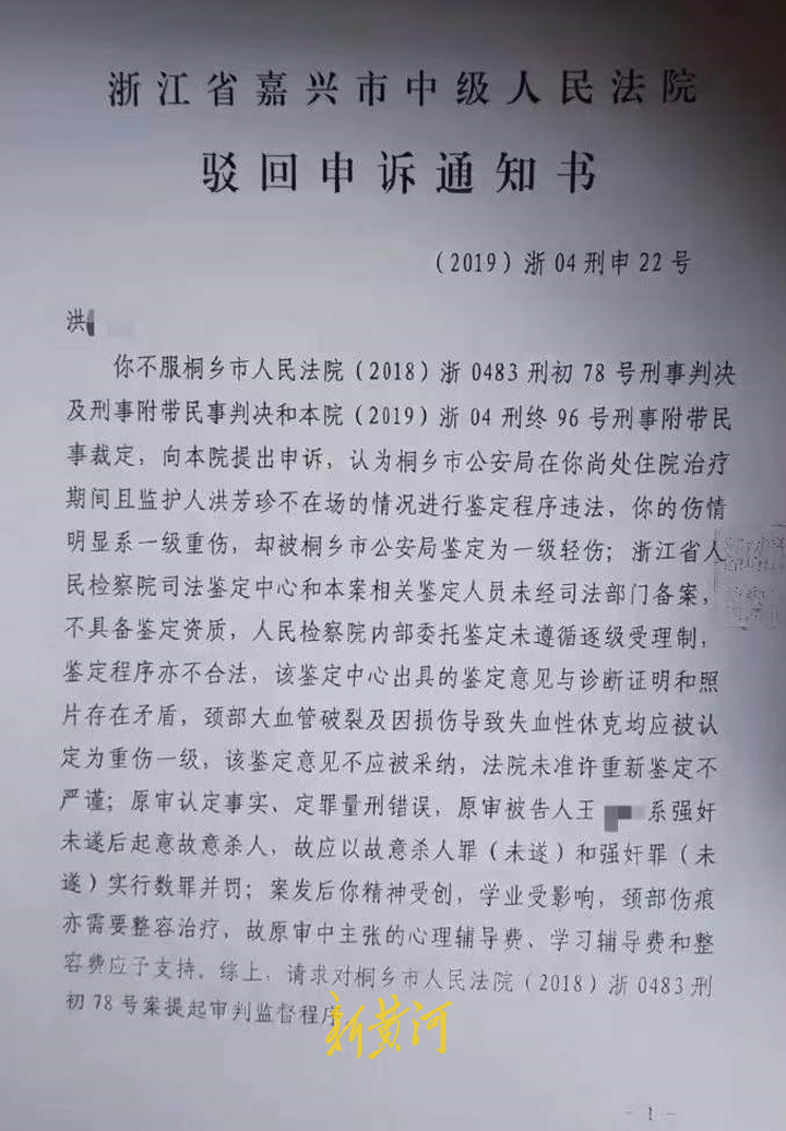 4年前,浙江省桐乡市,13岁的洪某某被人用菜刀割伤脖颈,施暴者王某峰是她的邻居,当年17岁。公检伤情鉴定洪某某均为轻伤一级,王某峰犯故意杀人罪,被判有期徒刑八年。