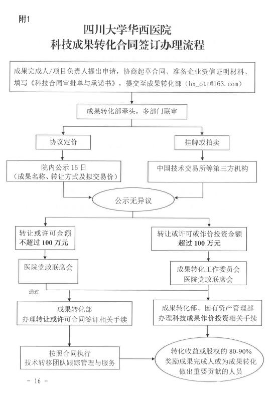 这对于一个单位的管理能力提出了挑战。在华西医院,与成果转化相关联的办法、规定等制度文件约有10部。其中,《科技成果转移转化九条激励政策(试行)》(“华西九条”)和《促进科技成果转移转化实施方案(试行)》(“华西三十六条”) 作为纲领性文件分别明确了政策与具体措施。基于对不同法条的深刻理解,华西医院的制度文件极力做到细化、可执行、程序化。在转化办理流程需要提交的文件、收益进入什么账户如何分配、成果转化工作委员会的召开程序等一一作出清晰的规定。细则规定,对于投资金额超过100万元的成果,启动成果转化工作委员会,负责审议、论证、评估、认定的工作。前面提到的委员会会议上要讨论的不同议题正是按照清晰的流程做好了前期的准备工作。