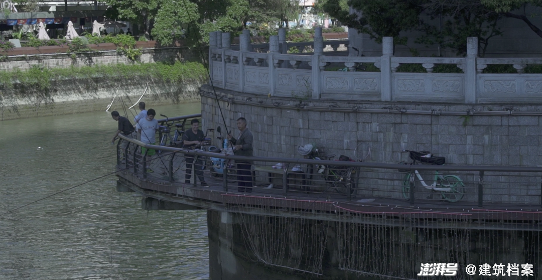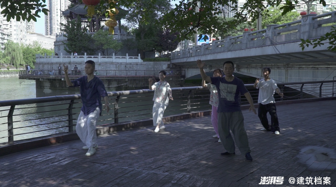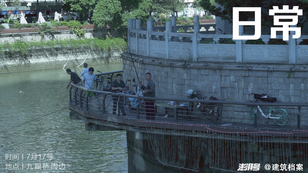 刘佳 (以下简称“刘”):九眼桥和文殊院这两个地方其实是成都比较宜居的地方,我们在九眼桥这个地方,可以看到不管是自然景观还是城市景观,在这里都有一些非常复杂的组合,我为什么选到这个地方,是因为它很有代表性,包括时间性的冲突,比如说这里晚上周围是酒吧街,但是早上你可以看到很多钓鱼、练太极的人,在这里24小时不同时间段发生着不同的行为,这是我感觉非常有趣的。
