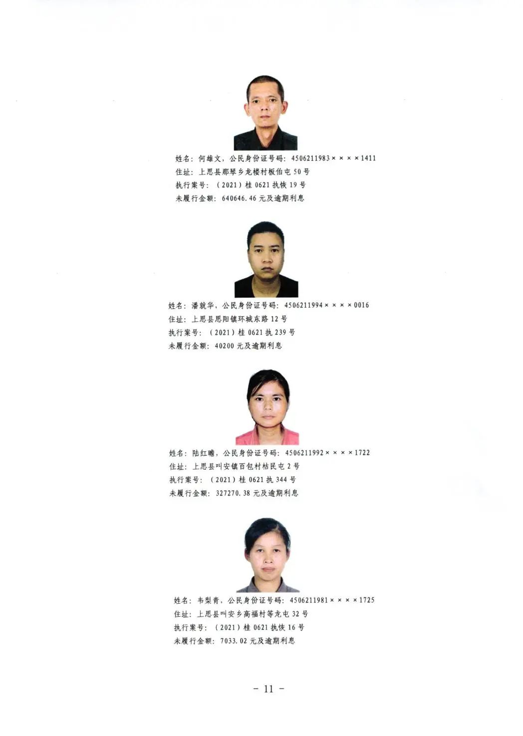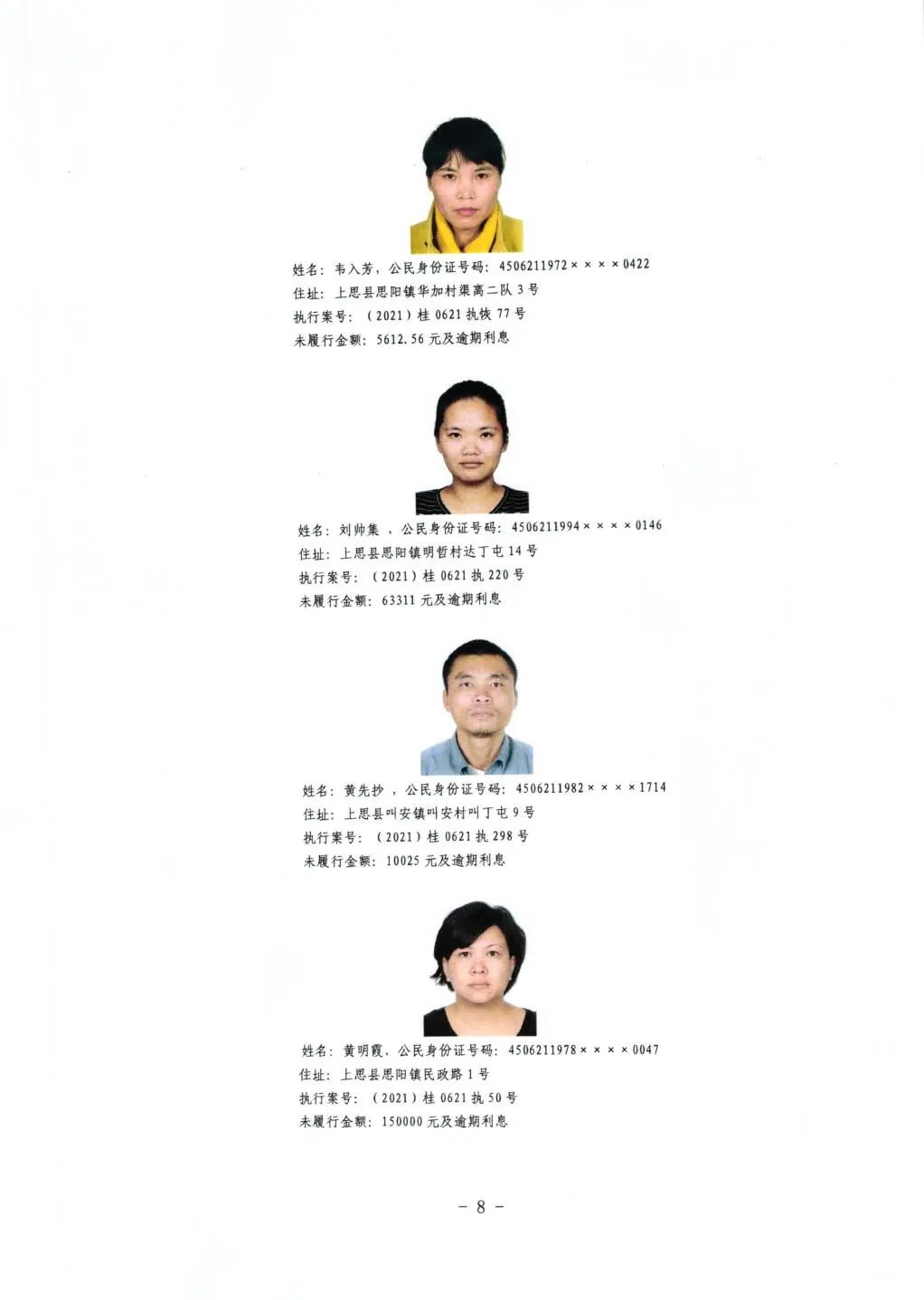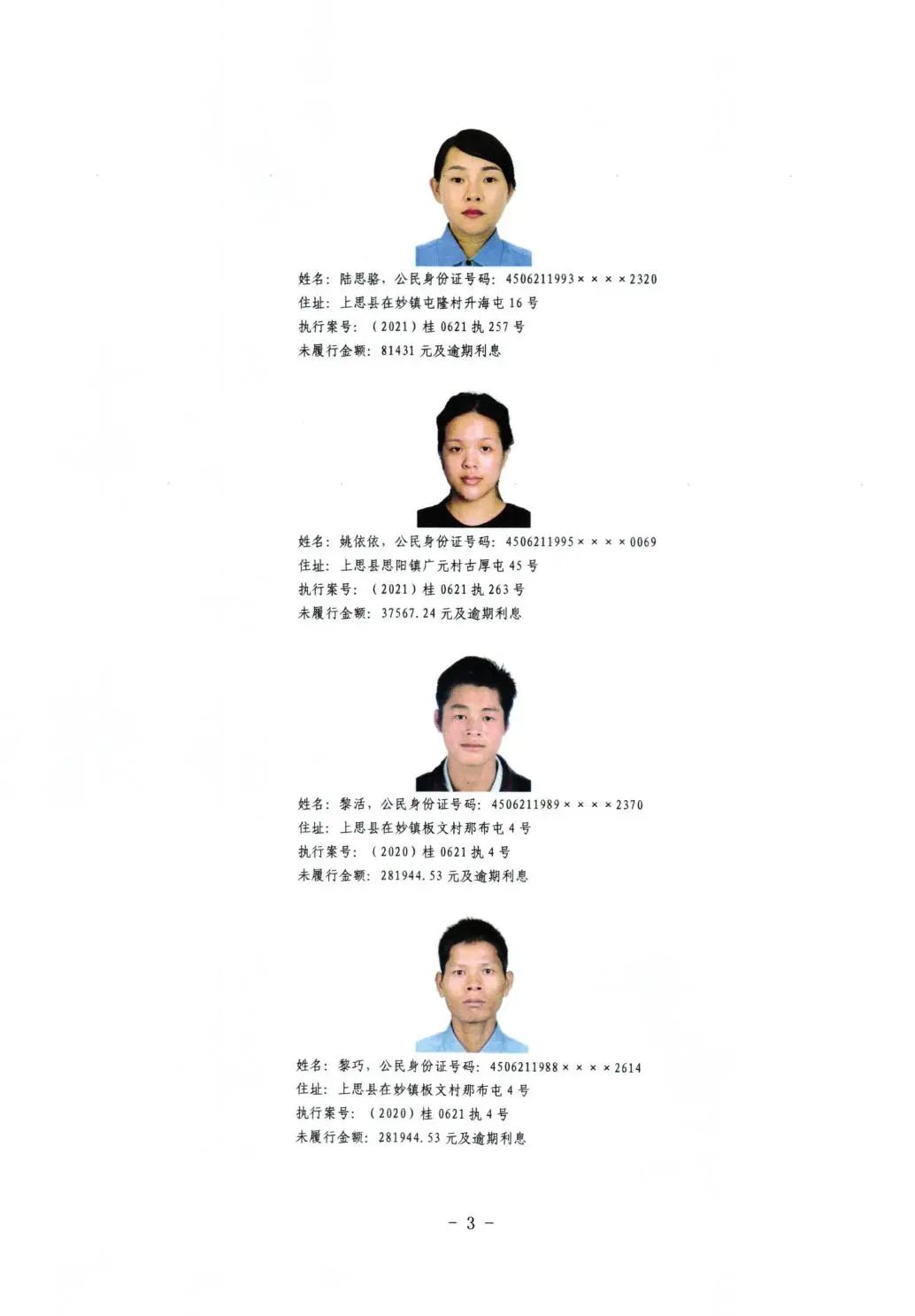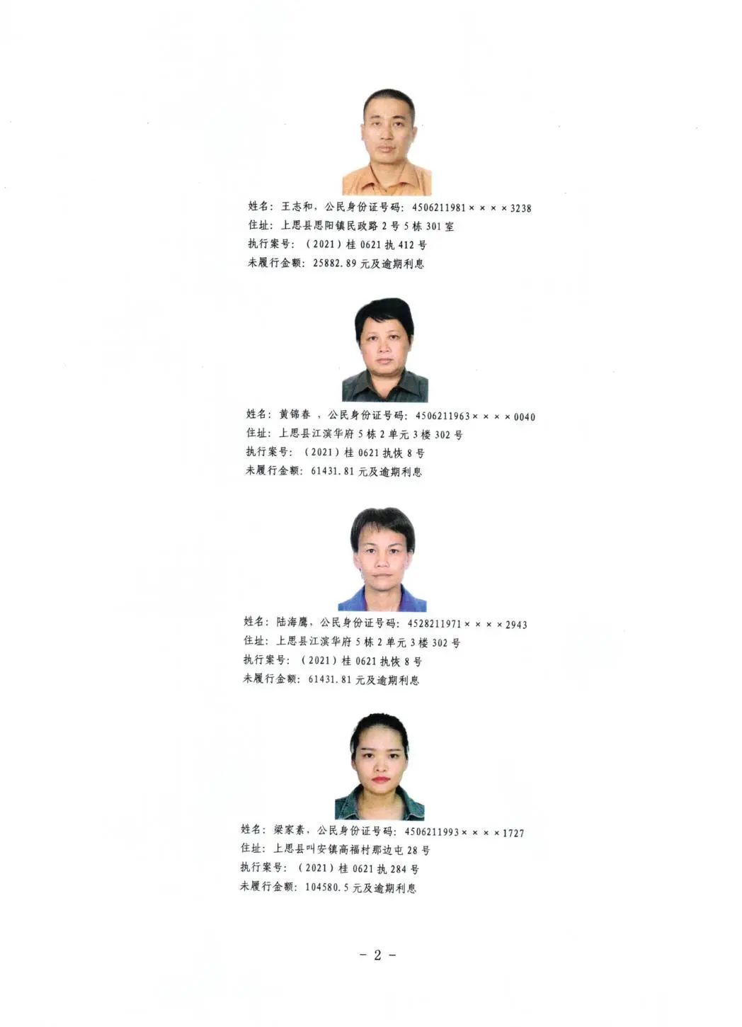 上思县人民法院关于公布失信被执行人名单的公告(第二批)