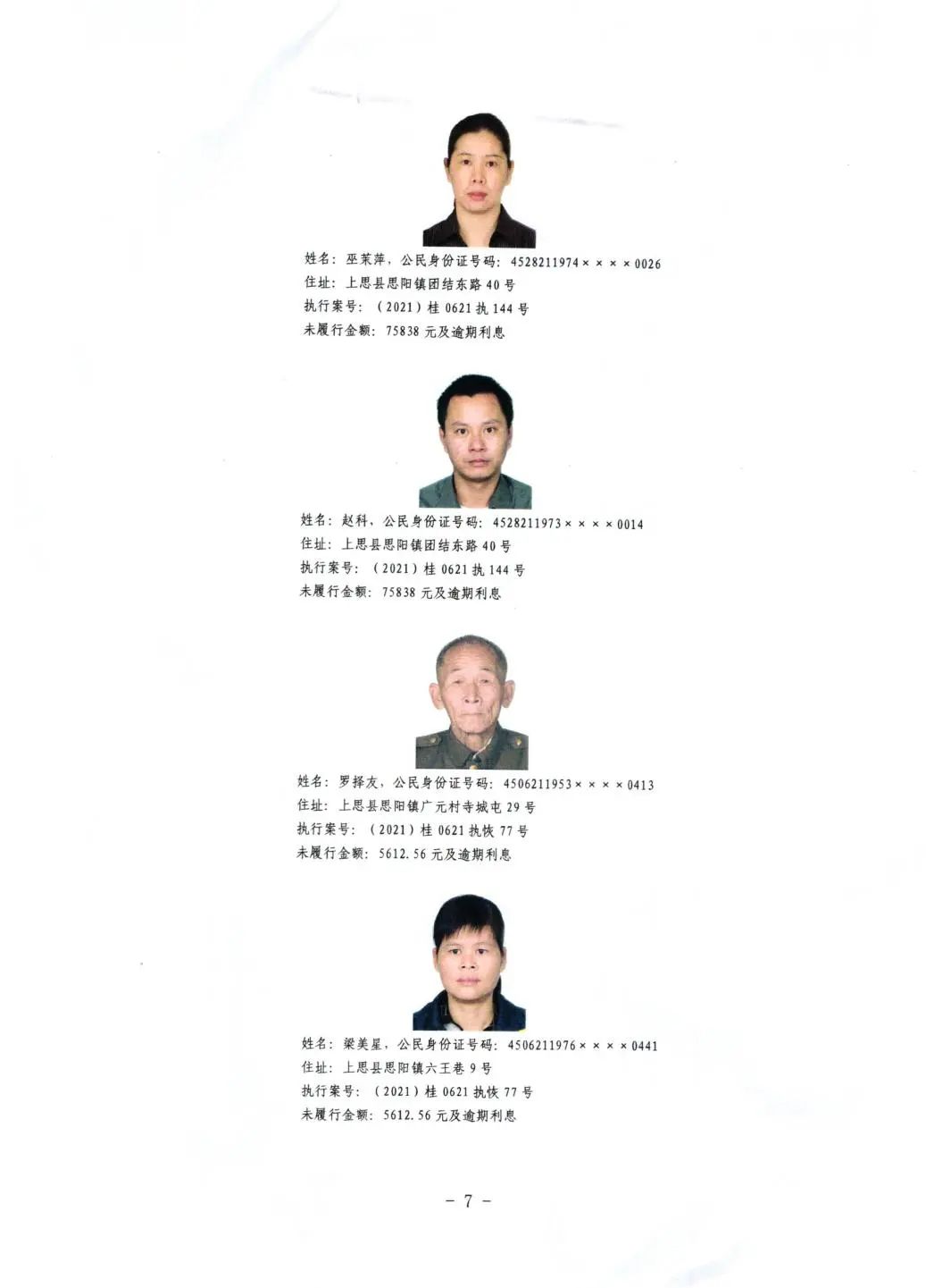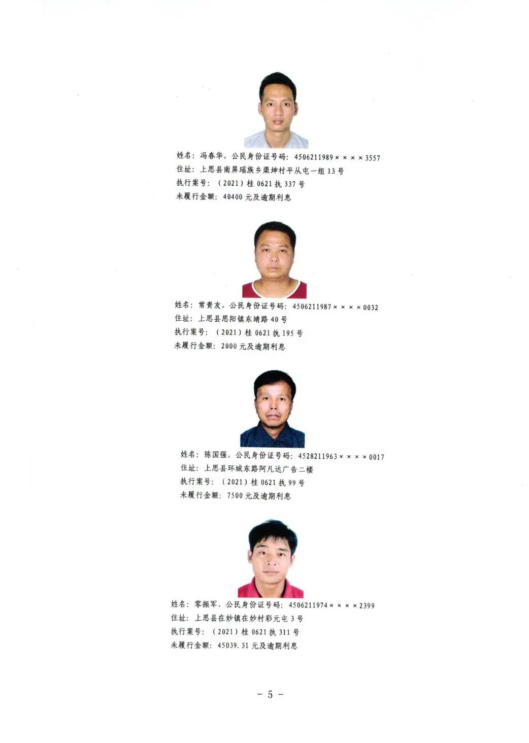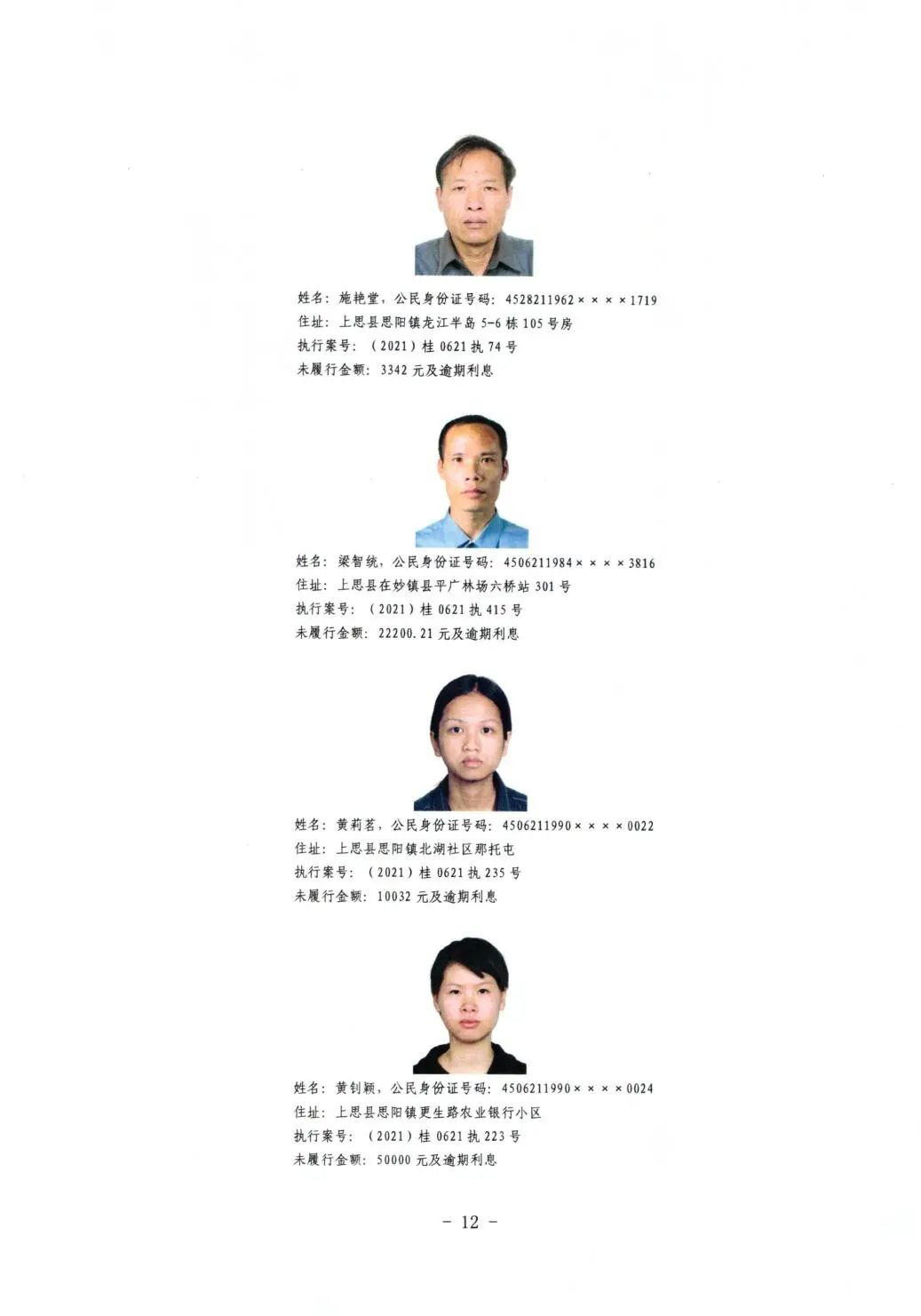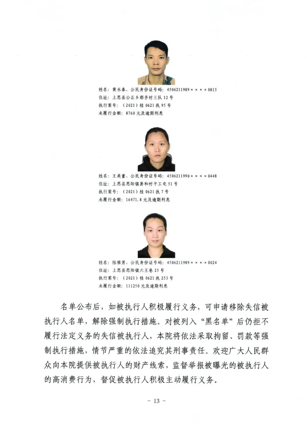 上思县人民法院关于公布失信被执行人名单的公告(第二批)
