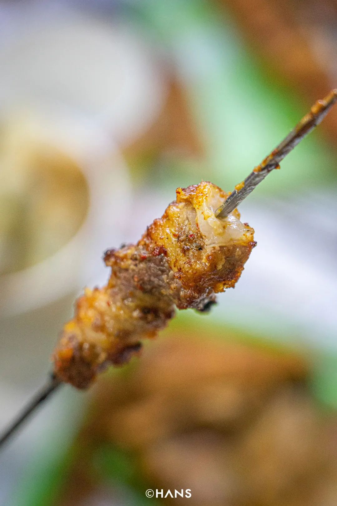 串肉还要讲究,三瘦两肥,一串肉有五坨,顺序得是:瘦肥瘦肥瘦。