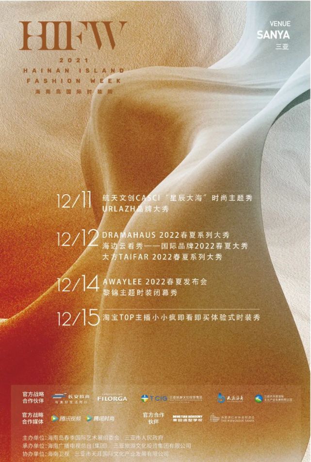 2021海南岛国际时装周将持续至12月15日。活动由海南岛春季国际艺术展组委会 、三亚市人民政府主办,海南广播电视总台(集团)、三亚旅游文化投资集团有限公司承办,海南卫视 、三亚市天涯国际文化产业发展有限公司共同协办。活动得到官方战略合作伙伴长安欧尚、法国FILORGA菲洛嘉、东田造型学校,官方战略合作媒体腾讯时尚,官方合作伙伴海棠湾红树林度假酒店等方面的支持。