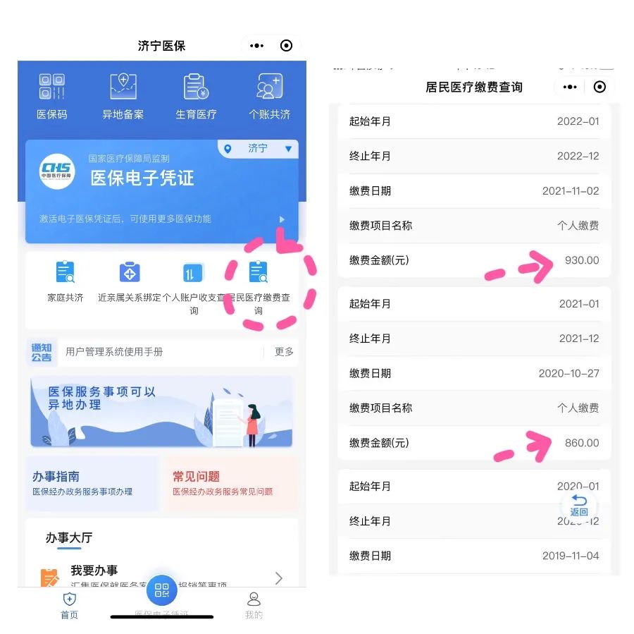升级后的“济宁医保”小程序也可以进行居民医保缴费情况的查询(注意:目前小程序支持参保居民个人登录查询;查询所显示缴费额为个人缴费部分与政府补助部分之和)