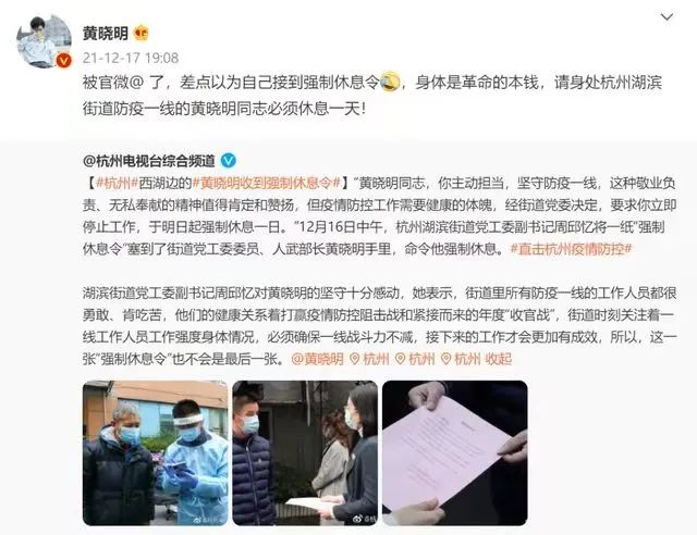 12)17日晚上,知名演员黄晓明在微博上点名杭州湖滨街道的黄晓明同志。他发微博称:“被官微@了,差点以为自己接到强制休息令,身体是革命的本钱,请身处杭州湖滨街道防疫一线的黄晓明同志必须休息一天!”