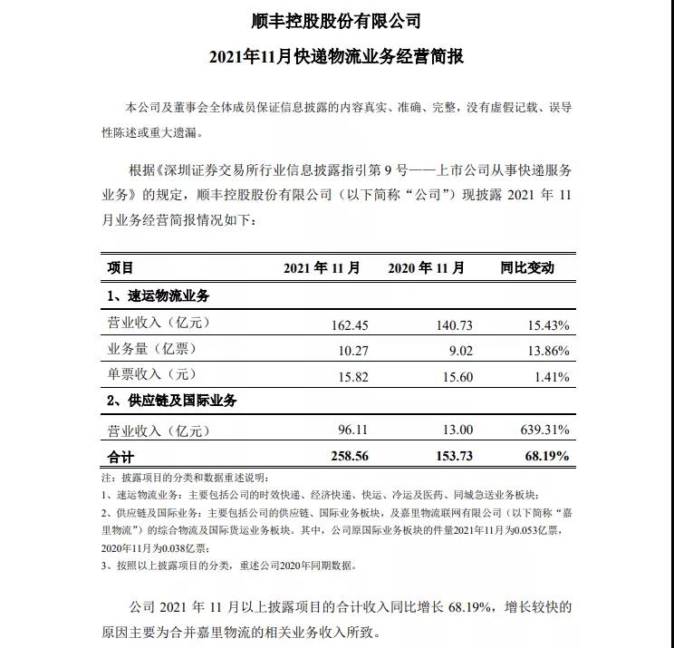 12月19日晚间,顺丰控股发布了今年11月的快递物流业务经营简报。日前,韵达、圆通、申通也发布了各自的11月相关经营简报。