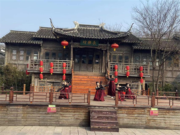 进入千古华村,不远处就到达了中心大舞台,正好赶上11点的“民俗杂耍+古风乐舞”表演,表演一共20分钟,杂耍和舞蹈穿插着表演,但演员十分单一,两组舞蹈只是分别换了套衣服,舞种和演员都没有变化。一旁的几个阿姨直接吃起了手中煎饼,表示这样的表演暂时没有拍照的欲望。