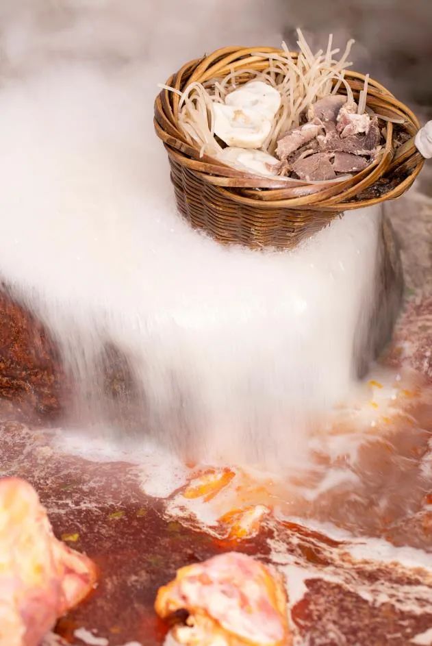 五颜六色的食材烩于一盆,其主料辅料及配料,多达20余种,将此盆上至餐桌上,腊香醇浓诱人,汤厚绵长,入口柔滑,回味无穷。