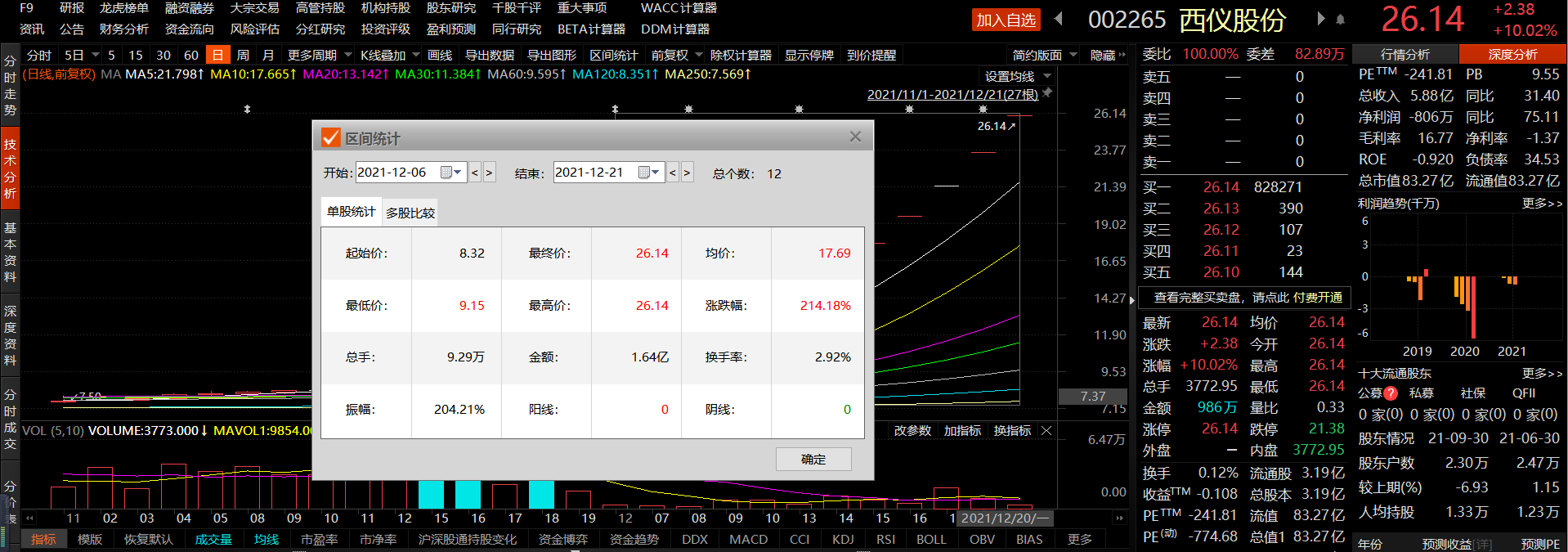 东方财富Choice数据显示,截至12月21日,西仪股份实现12连板,收盘报价26.14元/股,总市值83.27亿元。 在12月6日至12月21日这12个交易日中,西仪股份大涨214.18%。