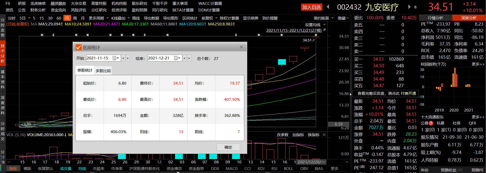 九安医疗于11月中旬开启上涨行情。在11月15日至12月21日这27个交易日里,九安医疗录得18次涨停,实现了407.5%的涨幅。今日收盘,九安医疗最终报价34.51元/股,总市值165亿元。