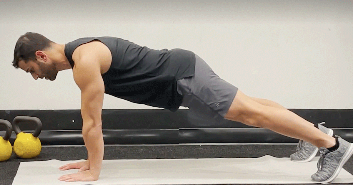 动作二:肩胛骨收缩高平板动作要领:从高平板姿势开始,肩膀在手腕的上方,感受核心用力,让身体从肩膀到脚成一条直线。