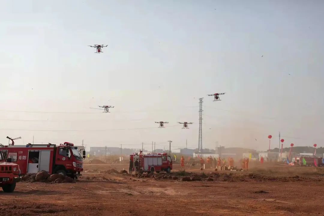 扑灭火现场上空,1架直升机和6架森林消防专用无人机组成的灭火机队犹如“天降神兵”,直升机通过吊桶洒水,2架无人机携带水基弹压制火势,3架无人机携带干粉罐灭火,1架无人机携带水管空中作业扑灭明火,同时,在地面部队风力、高压细水雾、水泵接力、高扬程水炮车等灭火方式的配合下,山火全部扑灭。这既紧张又惊险的陆空大作战“灭火”,是我省第二届森林消防职业技能竞赛的一个环节:森林火灾扑救演练,全方位、立体式展示省市县乡村五级森林火灾联动扑救流程以及航空消防飞机、无人机、特种消防车辆等新技术新装备在现代扑火作战中的应用。