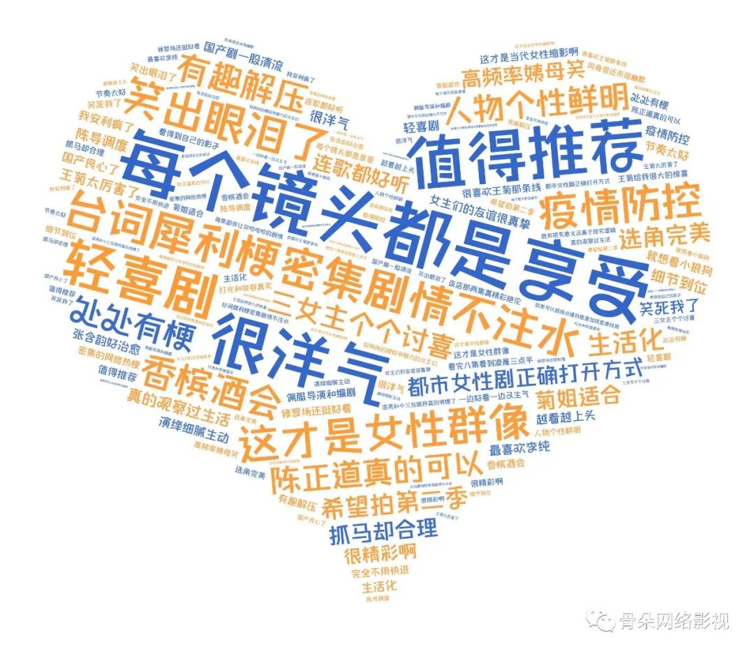 该剧虽以女性群像为外壳,但剧情内容不落俗套并以质感见长,无论是李纯、张含韵、王菊三位演员刻画的女生阵营,还是由刘冬沁、周澄奥、任彬、张帆、杨博潇等人打造的“男友圈”群像均讨喜有趣,有梗有料且密集输出,因此开播不久就被网友以一口气看八集的“爽剧”冠名。随着剧情推进,《爱很美味》的口碑评分从开播8.1上涨至了8.3,这种开局即口碑、直至完结仍能稳定上涨的现象,在一众都市剧里的确并不多见。从豆瓣词云图里也可看出,镜头拍摄、演员演技等带来的画面质感,以及人物设定、台词剧情等给出的化学反应,都成为了观众在追剧时的兴趣点。