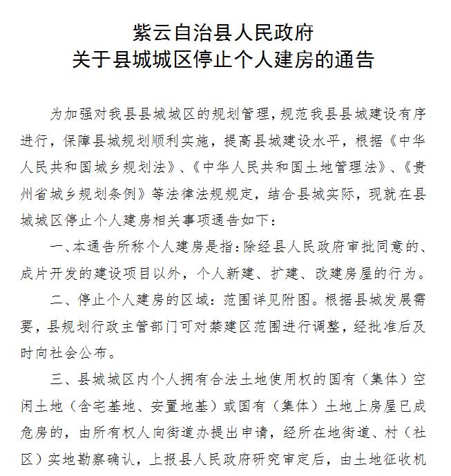 原标题:《紫云自治县人民政府关于县城城区停止个人建房的通告》
