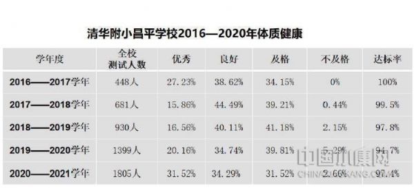 提高学生的身体素质,是体育教育的应有之义。清华附小昌平学校的体育教育数据报告显示,在国家学生体质健康标准测试中,该校优秀率连续5年持续提升,2020—2021学年及格率高达97.4%,优秀率达31.52%。其中,五年级的表现尤为亮眼,六项细分项中三项的优良率超过70%,肺活量优良率为75.6%,跳绳优良率为86.42%,一分钟仰卧起坐优良率为89.59%。同时,2015—2020五年间的昌平区小学生体育健康监测数据还显示,该校学生近视率与肥胖率逐年下降,2020年比2019年下降幅度达1.09%。