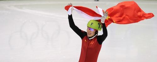2010年2月20日,周洋在温哥华冬奥会夺得短道速滑女子1500米冠军后手持五星红旗庆祝。新华社发