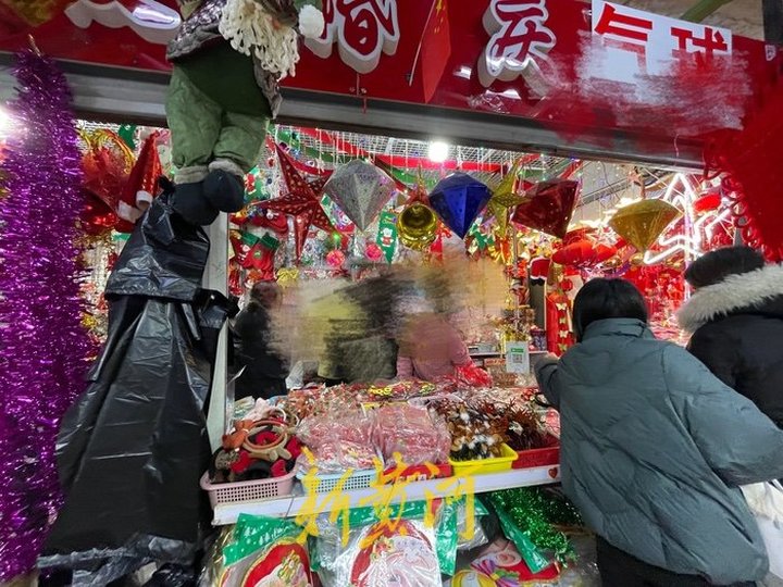 24日上午,纷飞的雪花和商铺玻璃上张贴的饰品透着浓浓的圣诞气息,新黄河记者来到了位于槐荫区的西市场小商品批发市场。尽管今日室外温度已降至零摄氏度,市场内依旧热闹非凡,售卖圣诞周边产品的店铺前围着不少市民,手提大塑料袋选购商品。