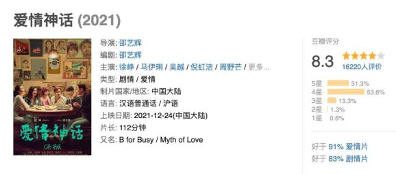 ▲《爱情神话》目前豆瓣评分8.3这不是一部纯粹的喜剧片,却适时让人捧腹,具有现实主义与女性主义元素,可你绝不能用其中任何一个词单独概括它。