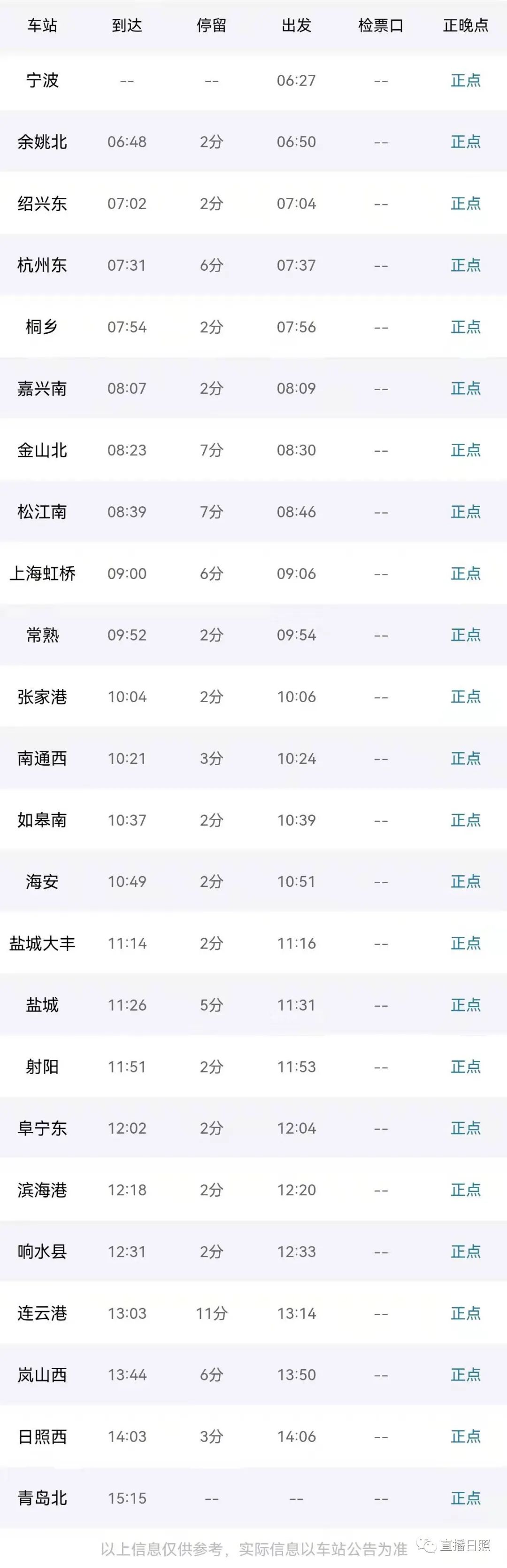其中D2160次宁波6:27始发,绍兴东7:02到7:04开,杭州东7:31到7:37开,嘉兴南8:07到8:09开,日照西14:03到14:06开,宁波到日照用时7时36分。