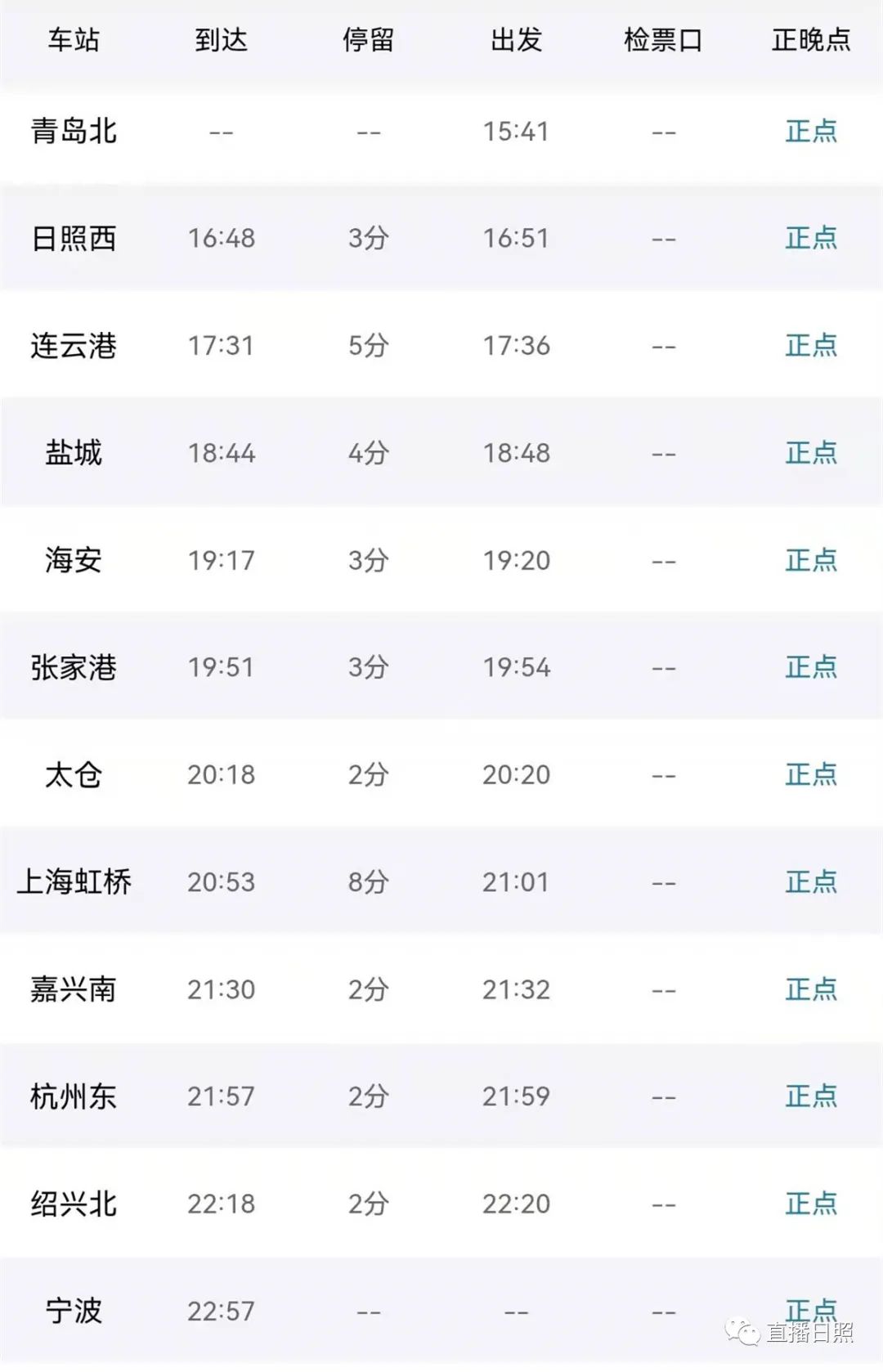 D2159次青岛北15:41始发,日照西16:48到16:51开,嘉兴南21:30到21:32开,杭州东21:57到21:59开,绍兴北22:18到22:20开,22:57终到宁波,日照到宁波用时6时06分。