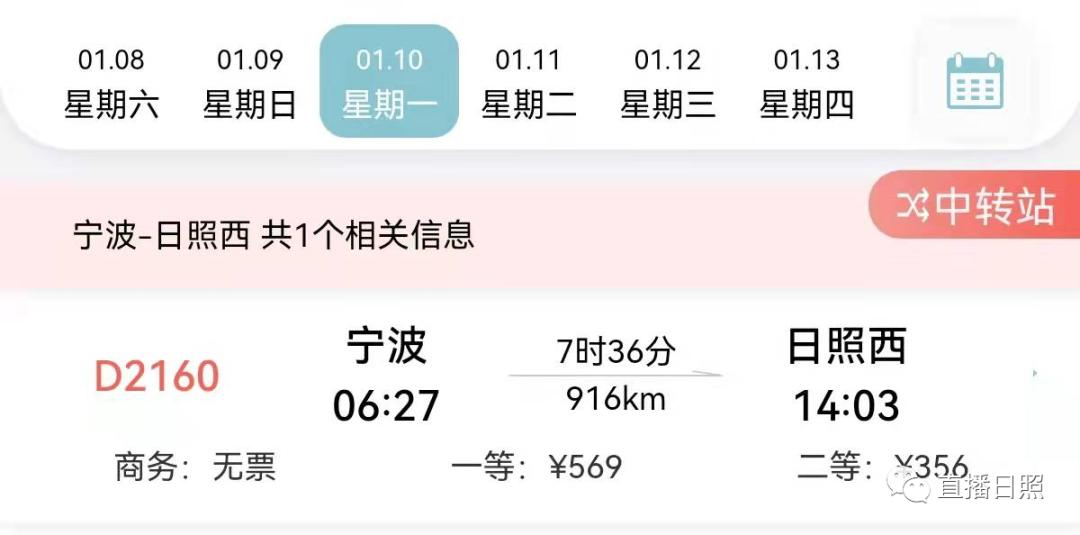 票价方面,宁波到日照西一等座569元,二等座356元。