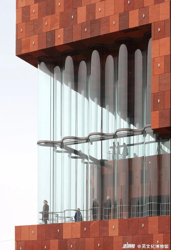 河畔博物馆的外墙立面,则由错落分布的红色砂岩面板组合而成,这些砂岩板尺寸均为100x60厘米,来自四个不同的采石场。它们在色泽和形态上拥有细微的差异,这使得整幢建筑在阳光下显得斑驳迷离,富有艺术感。在外墙上还覆盖有一些手状的金属装饰图案,它们取材于安特卫普流传已久的民间传说:当地的巨人会将不愿支付过路费的路人的手残忍砍下,并把它扔到斯海尔德河中。根据传说,这正是这座城市的名字的来源(hand werpen在荷兰语中的意思是“将手扔掉”),手状装饰也逐渐成为安特卫普的历史性象征物。
