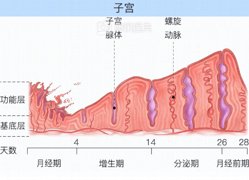 子宫内膜在雌、孕激素的作用下,发生着周期性的生长、增厚。