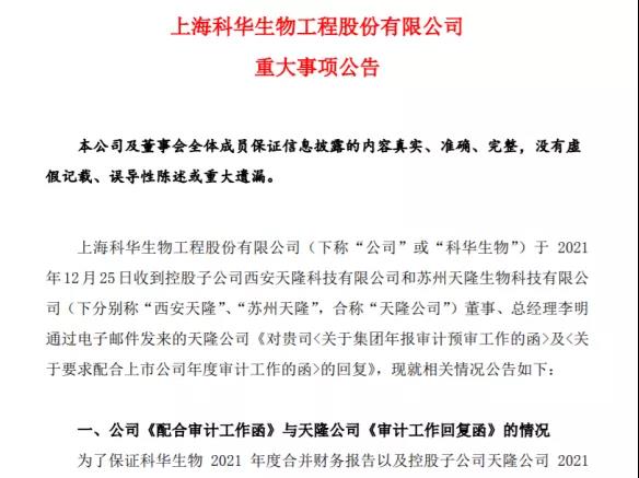 2021年12月22日,科华生物董事长以天隆公司董事长的身份,通知在27日召开天隆公司董事会会议,审议年度审计工作议案,拟责成天隆公司财务部门和相关人员全面配合和支持立信会计师开展对天隆公司2021年财务报告的审计工作。