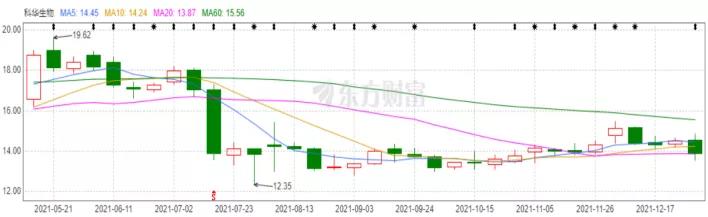 但目前,科华生物的境况也不免让人“担忧”。今年7月份的仲裁案,加上如今年底的“暴雷”,科华生物其二级市场的态度也很鲜明。数据显示,今年5月,其股价还在19.62元/股的高位,在7月16日以0.2元/股进行过一次派息后,股价再未出现较大浮动,一直在13元/股左右徘徊。