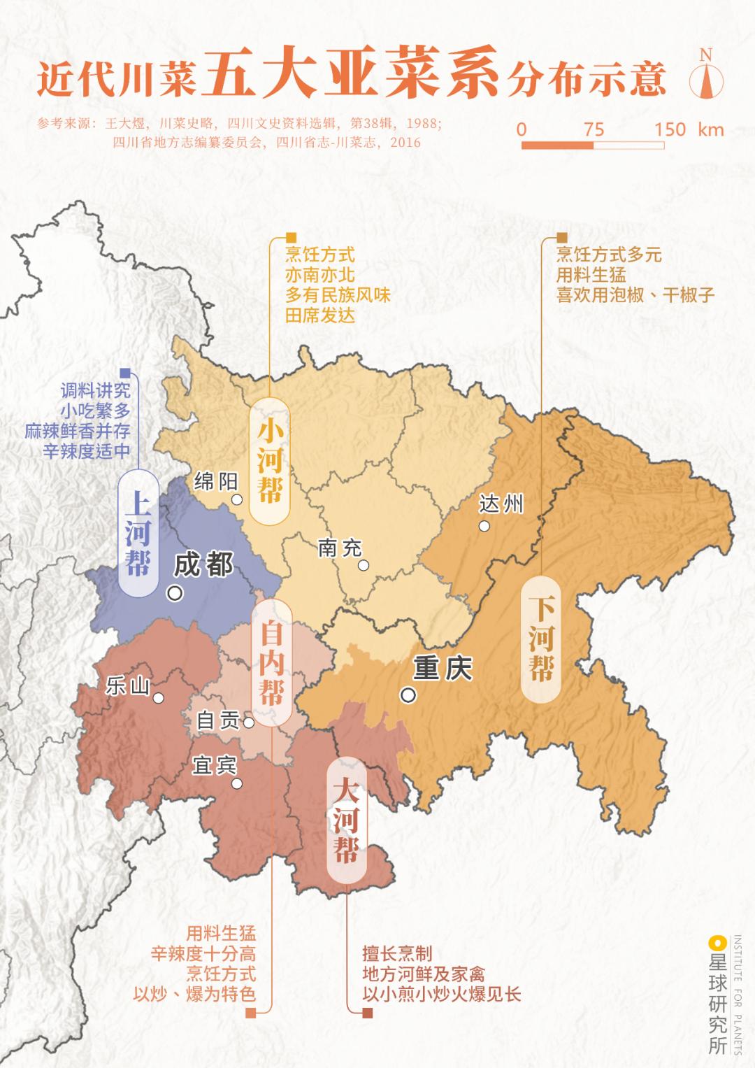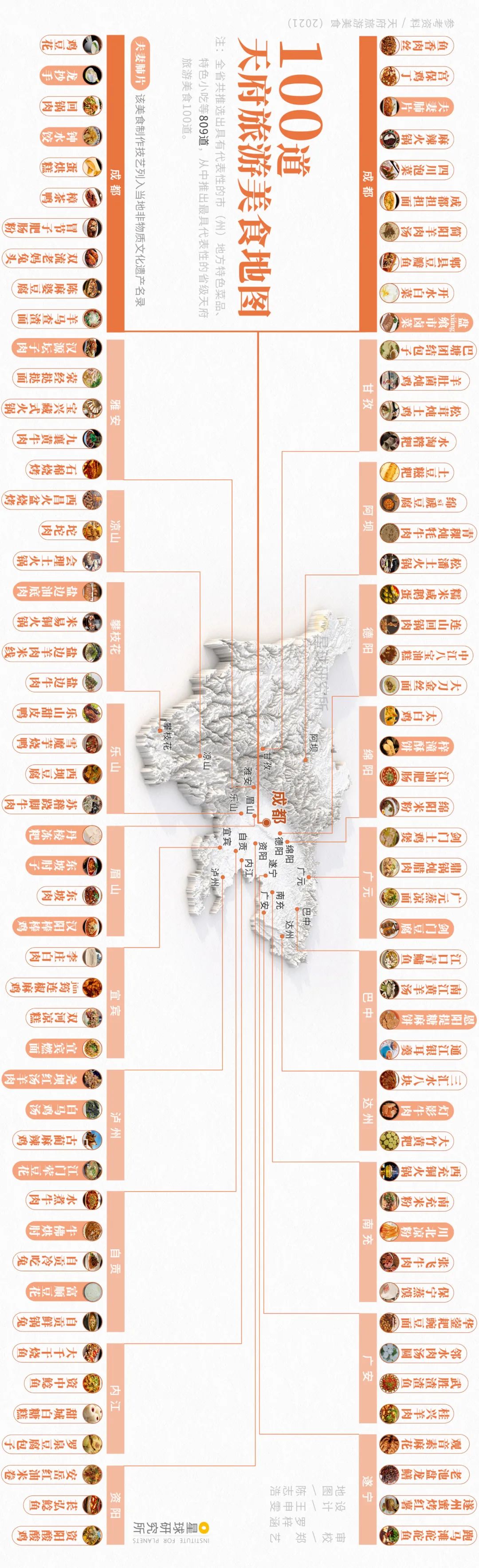 (川菜诞生于巴蜀,含今四川与重庆;下图为四川的“100道天府旅游美食地图”,请横屏观看,制图@陈志浩&王申雯&罗梓涵/星球研究所)