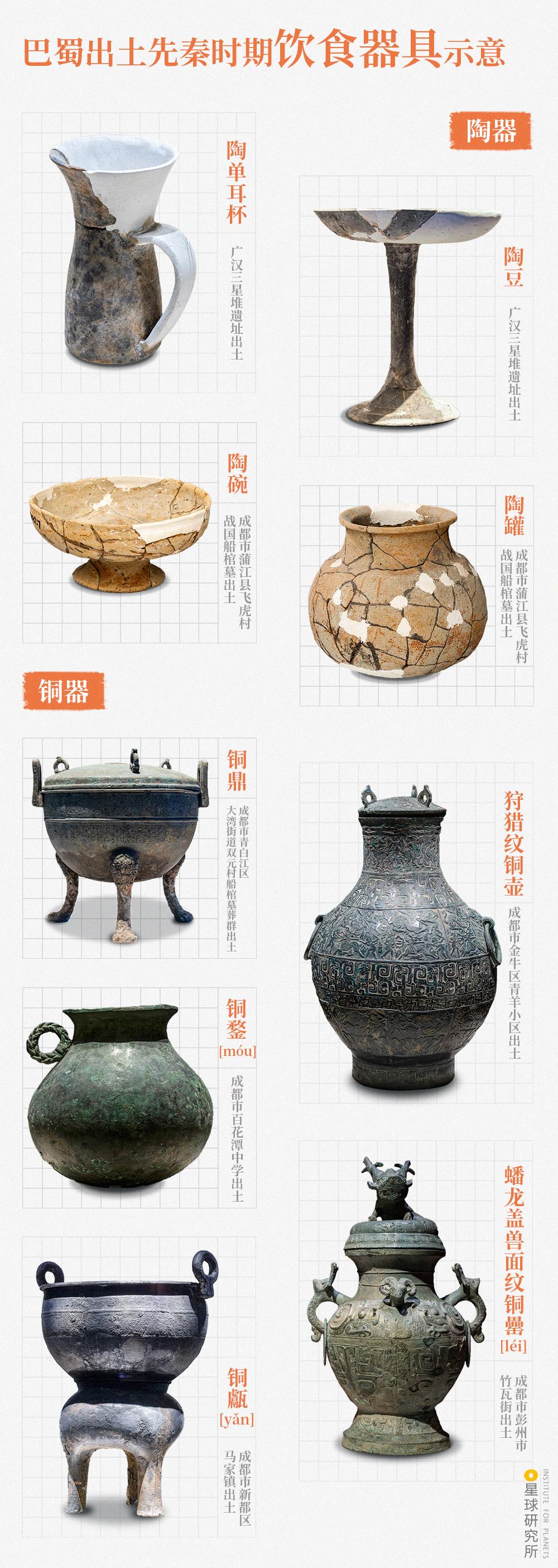 (巴蜀出土先秦时期饮食器具示意,制图@罗梓涵/星球研究所,摄影师@张艳)