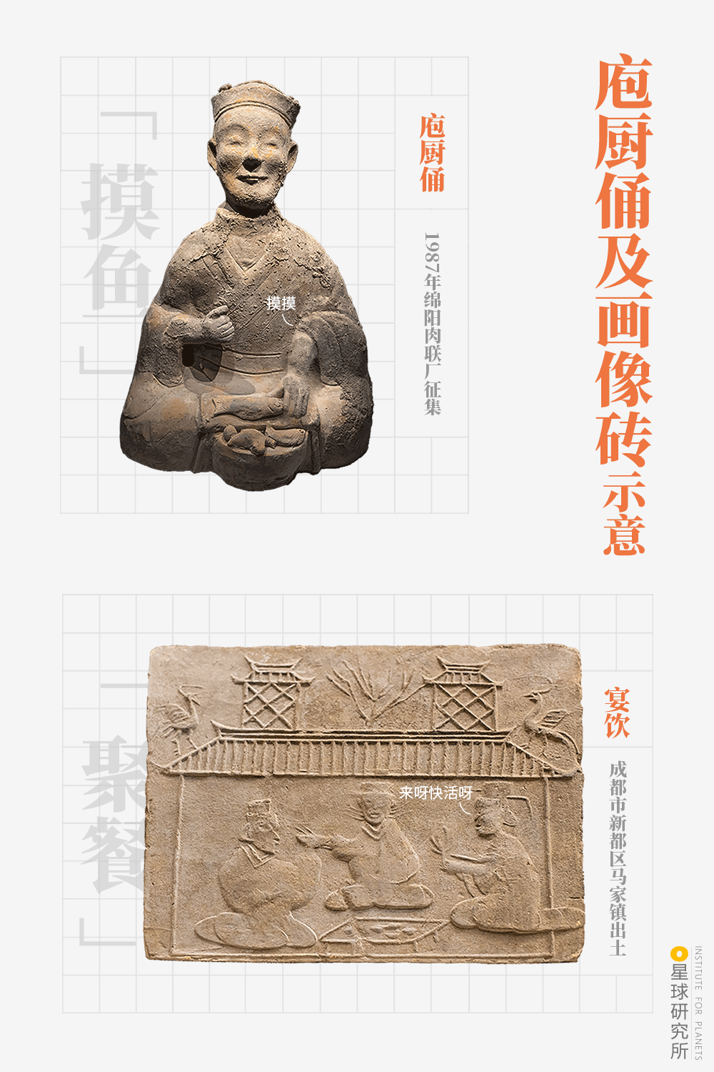 (“吃”无疑是巴蜀人生活中的要事之一;下图是四川出土的“庖厨俑”及“画像砖”示意,制图@罗梓涵/星球研究所,摄影师@柳叶氘&徐剑峰)