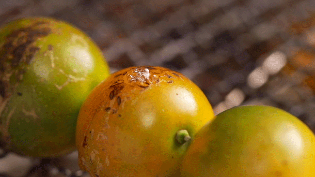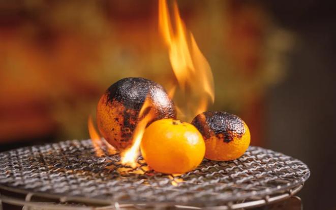 除了金桔,柑橘类的水果中,砂糖橘也到了最好吃的时候,不用剥皮,整个橘子放在火上烤,烤到表面略微焦糊,放凉后剥开。