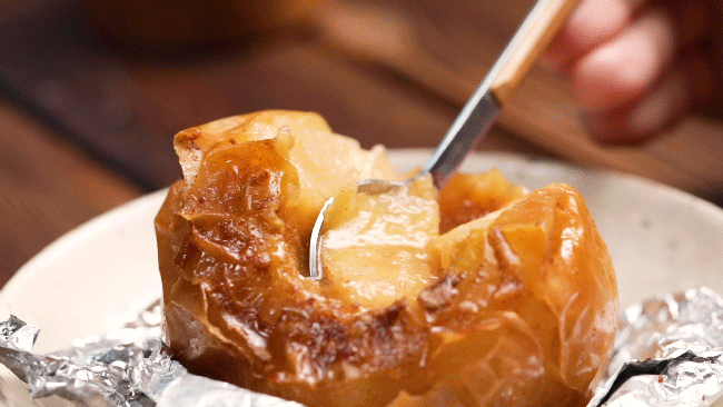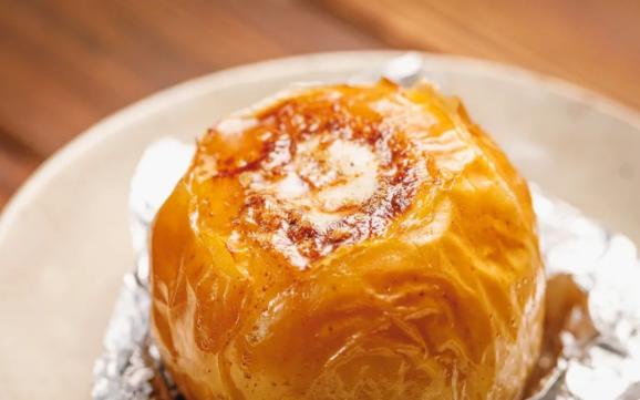 记得一定要用锡纸包紧底部,不然爆开的汁水都流完了。放进预热好的200℃烤箱,烤上35-40分钟,你就能收获一颗绝美的黄油烤苹果。苹果皮变软,黄油块彻底融化在内部,肉桂粉和白砂糖又是最好的甜味加持,仅仅是香味,就让人欲罢不能。