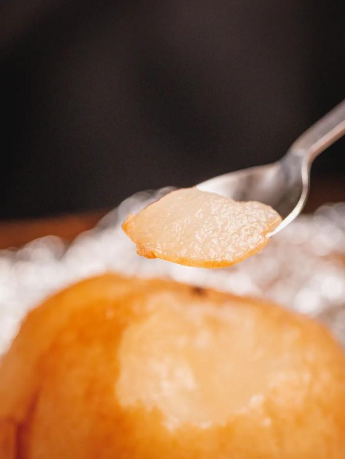 而且梨子本身纤维比较硬,经过烤制后变得非常软糯,里面的果肉柔软多汁,仿佛在吃果冻。皇冠梨的果肉烤完后更软一点,秋月梨则是酸甜口,两者各有千秋。我更推荐大家买皇冠梨,性价比又高,汁水也更多,只要放进烤箱一烤就完事儿。