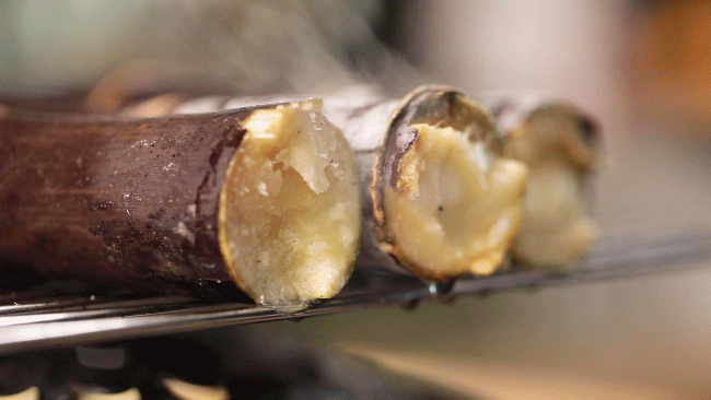 烤甘蔗是海南街边的热门小吃,整根甘蔗直接放在炭火上烤,烤完后趁着热乎劲儿削皮,拿着手啃或是榨成一杯滚烫的甘蔗汁。烤完的甘蔗虽然吃上去没有那么爽脆,但烤了之后,味道更香更甜,汁水完全都锁在里面,甘蔗的头尾疯狂滋出水分,散发出一阵阵蔗糖的醇香,好吃程度完全出乎我们的意料,算是最惊喜的烤水果了。