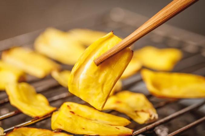 在海南,还有一种小众的烤水果—烤菠萝蜜。菠萝蜜用刀去核,把它撕成小块,在烤盘上刷一层薄油,一个个整整齐齐地码上去。最重要的是注意火候,火一大,菠萝蜜很容易变焦。它极速收缩后,汁水全部都蒸发了,口感更有韧劲,香香脆脆,更像是在吃果干。但是和其他烤水果比起来,它还是少了一份惊艳。