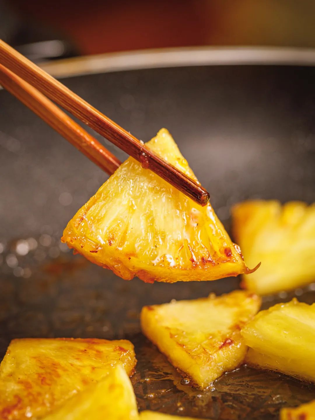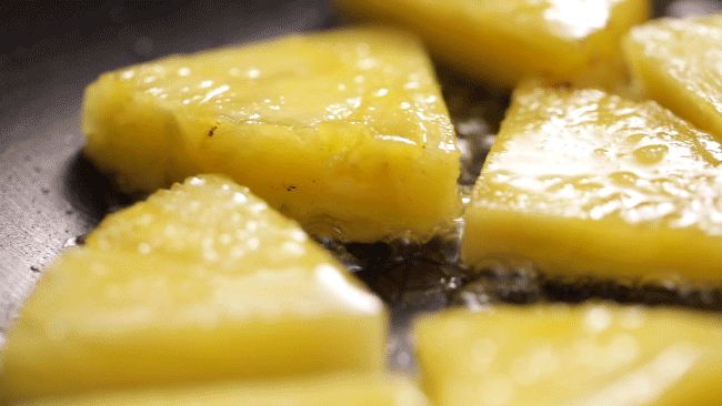 烤菠萝也是很常见的烤水果,日料店、烧烤店都有供应。菠萝切成小块,或是圆形状,需要提前在盐水中浸泡,沥干表面的水分后,放入平底锅煎烤,直到表面变成焦黄色。