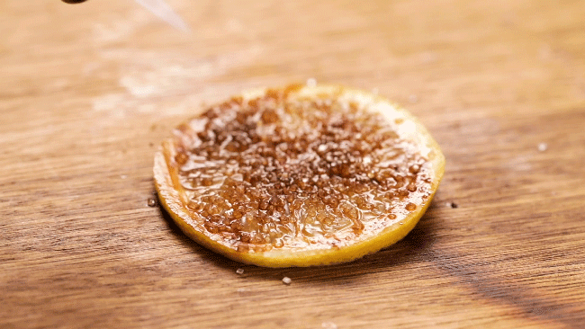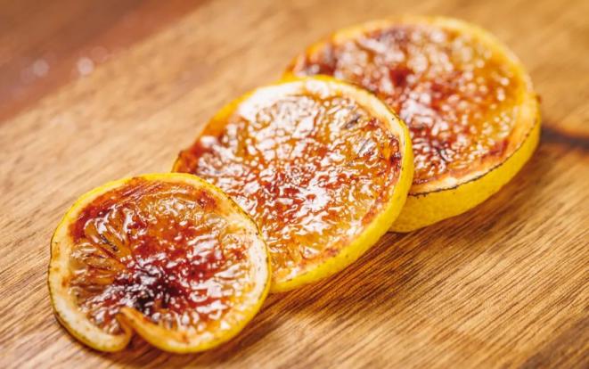 最后撒上白糖,淋上一层朗姆酒,酒香味激发出菠萝的果香,还没尝就感觉醉了。因为现在不是吃菠萝的季节,菠萝单吃不够甜,但这样一煎一烤,赋予了它多种层次,吃着怪上头的。11 | 咖啡柠檬片