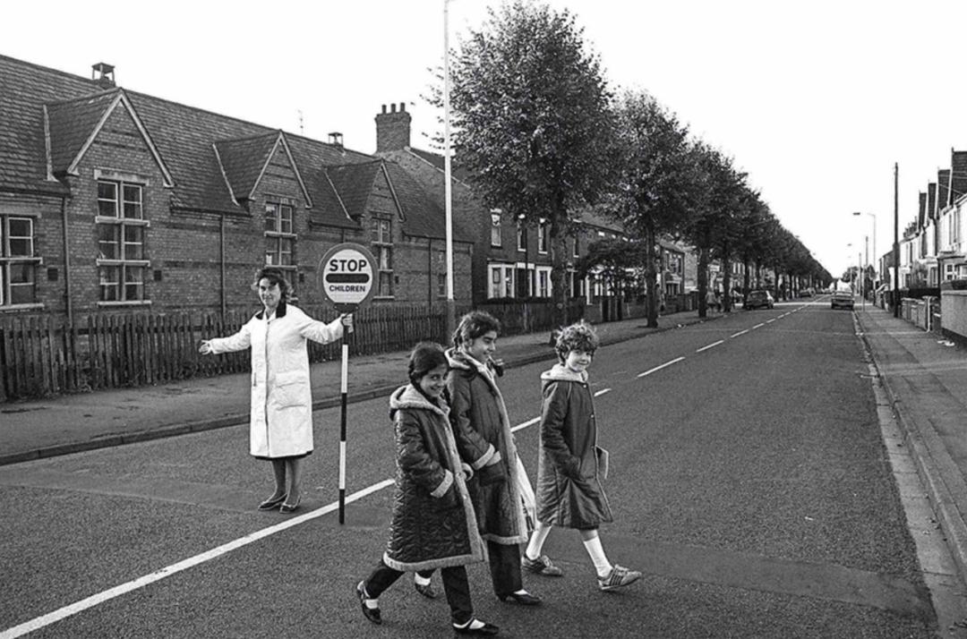 1984年,三个小朋友正在安全员阿姨的护送下过马路: