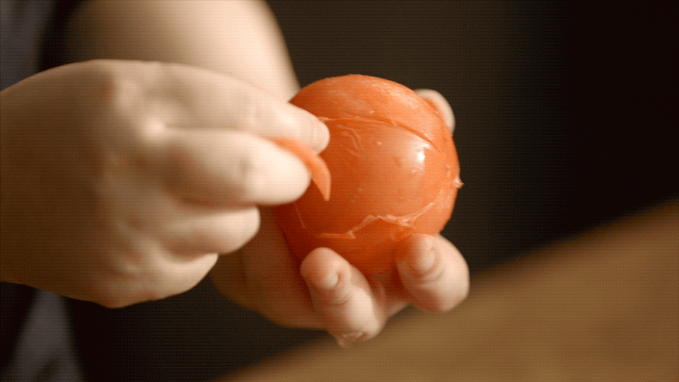 先来准备配菜,番茄划十字,用热水烫皮,切成小丁。洋葱切成小块备用。