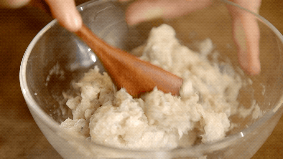 虾滑可以直接买现成的(自己做真的太费劲了!)为了提鲜,我们可以往里加少许盐和糖,搅拌均匀。