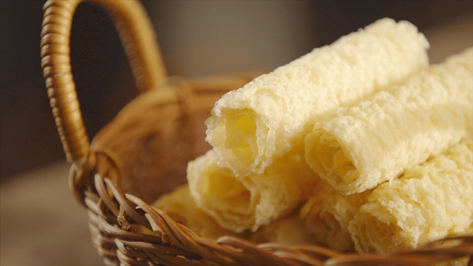 接下来就是包响铃卷的环节,先把响铃卷在清水里打湿,拿出后放在案板上静置30秒,这样打开的时候,它不容易裂开。