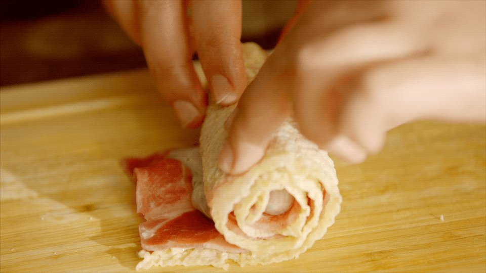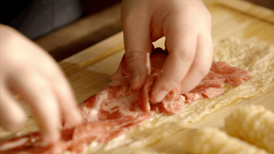 往响铃卷上均匀铺上两片肥牛,再来一层虾滑,从左往右轻轻卷起来,注意动作一定要轻和温柔,不然很可能在半路就翻车了。