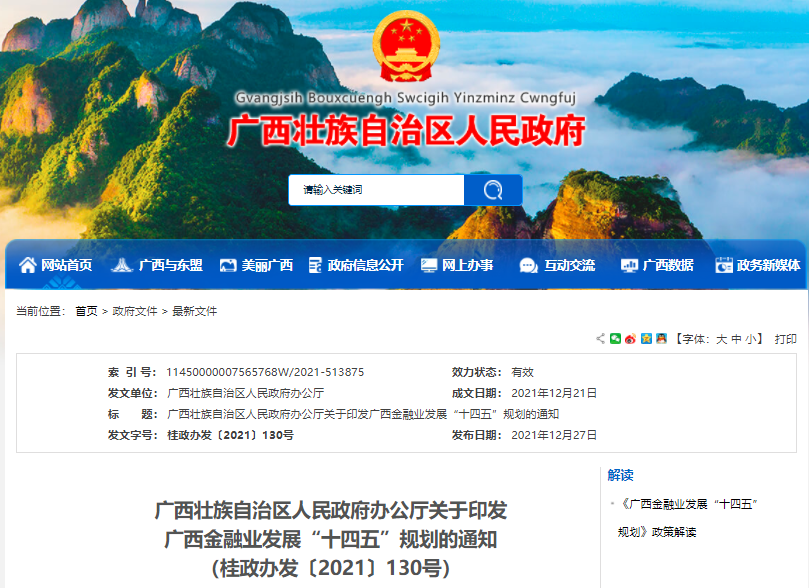 经自治区人民政府同意,《广西金融空间布局“十四五”规划》(下文简称《规划》)已印发实施,这是全国首部省级金融空间布局规划。12月29日,自治区政府新闻办举行解读《广西金融空间布局“十四五”规划》新闻发布会,介绍有关情况并回答记者提问。