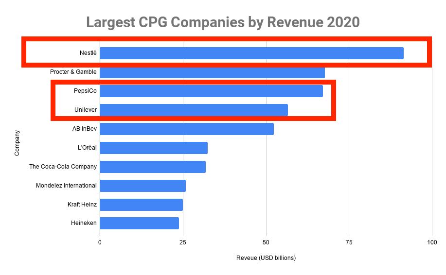 雀巢是世界上最大的快消公司之一,在全球拥有500多家工厂。2020年净销售额远超百事、联合利华等大牌快消,一直稳坐食品饮料市场第一把交椅,在2017年福布斯全球最大上市公司 综合榜 位居前三。