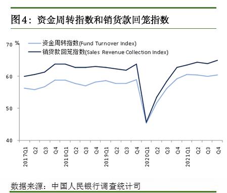 6.资金周转指数:反映企业家对本企业本季资金周转情况判断的扩散指数。该指数的计算方法是在全部调查的企业中,先分别计算认为本季企业资金周转“良好”与“一般”的占比,再分别赋予权重1和0.5后求和得出。