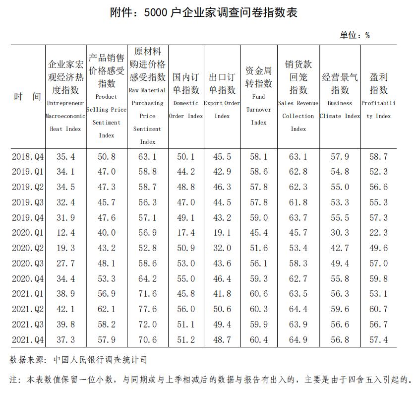 2021年第四季度中国人民银行企业家问卷调查结果显示: